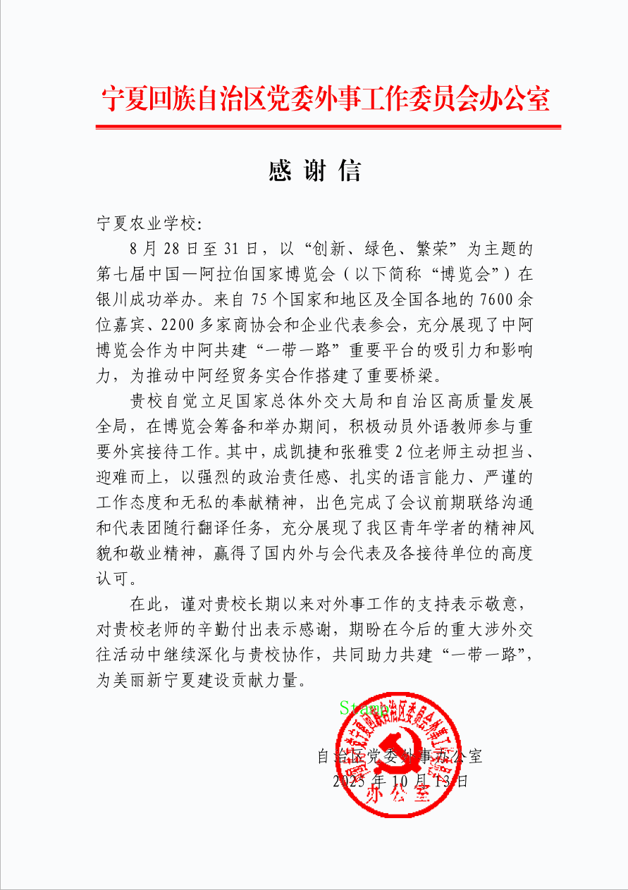 按照自治区党委外事工作委员会办公室有关要求,我校选派的成凯捷和张雅雯老师参与博览会重要外宾接待与宴会翻译工作,她们凭借强烈的政治责任感、扎实的语言功底、严谨的工作态度和无私的奉献精神,出色完成相关翻译任务,充分展现了我校教师的专业素养与使命担当,赢得国内外与会代表及各接待单位的高度认可。近日,宁夏回族自治区党委外事工作委员会办公室特发来感谢信,对两位教师的辛勤付出予以表扬,同时对学校长期支持外事工作表示敬意。